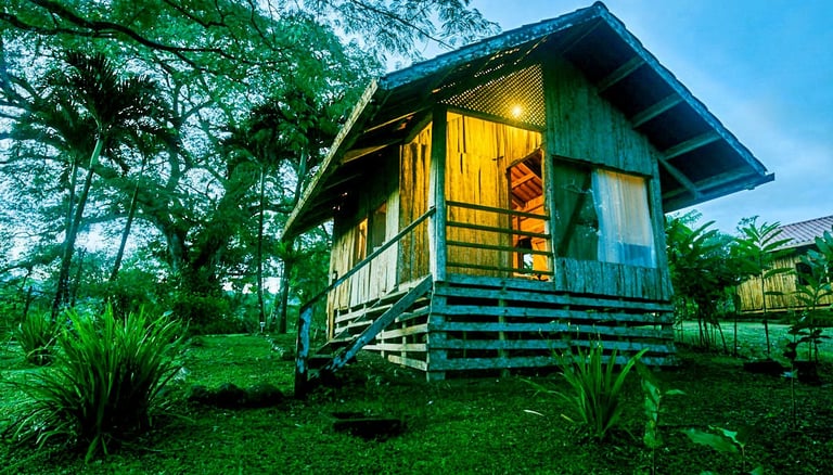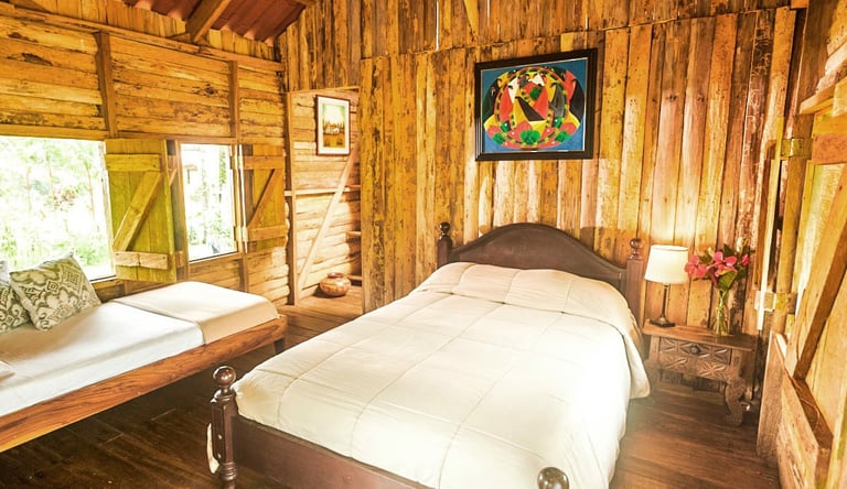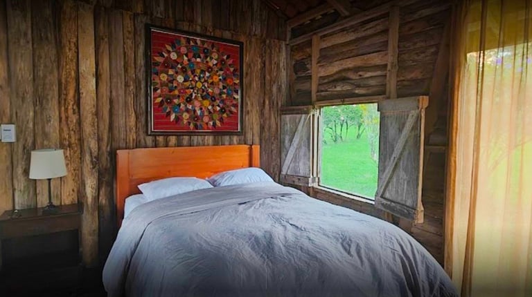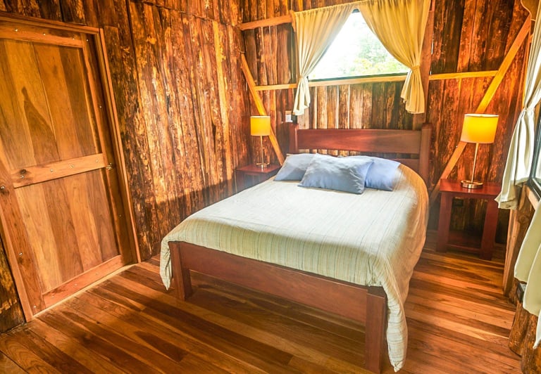 Nuestras acogedoras cabañas están diseñadas para tu confort, con agua caliente, mosquiteras que te protegen mientras disfrutas del entorno, y amplios ventanales que te sumergen en la belleza natural que te rodea